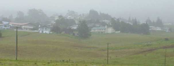 The landscape changes along the Kohala Coast. The northwest highway ranges from fields of black lava dotted with white coral graffiti messages, to green fields and cowboy country. This area is home to the famous Parker Ranch, one of the largest privately owned cattle ranches. One of the larger inland towns is Waimea, it has a small airport, but jet traffic is confined to Kona, on the west side, and Hilo on the east. Waimea is above the 3000 foot elevation, and is at times foggy and usually cooler than low areas. You are ascending the slopes of Mauna Kea the northern most sleeping volcano on the "Big Island". Waimea was very friendly and very inexpensive for food and other items. I highly recommend it for a stop. Highway 19 crosses over the north slope of Mauna Kea and starts heading for the coast. You will see the landscape turn into rainforest as you approach the northeastern "Hamakua Coast". From here to Mauna Loa (Hawaii's Active Volcano) is much different country.